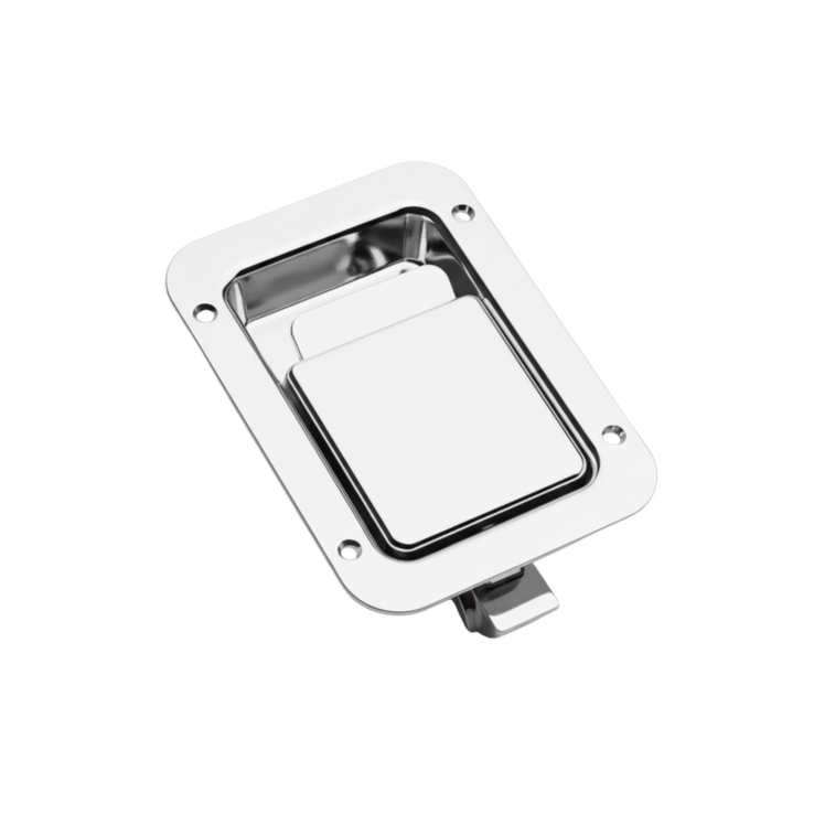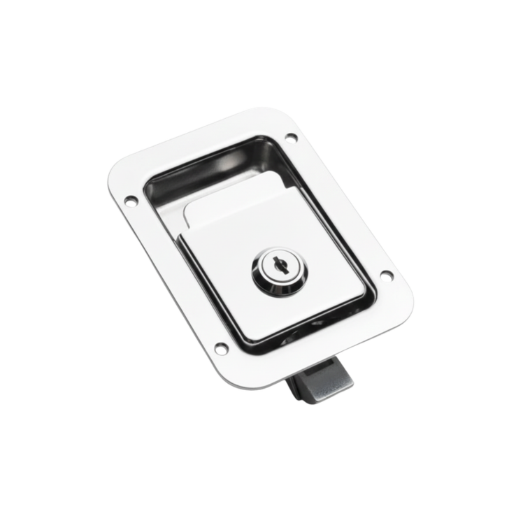 O fecho de impacto mini lingueta reta com sistema de pressão para fechar e puxar para abrir, ideal para aplicações industriais que exigem robustez, segurança e facilidade de operação.