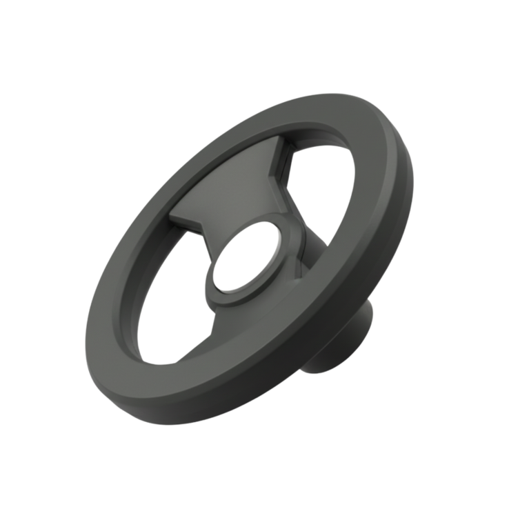 O volante de 2 raios é projetado para aplicações industriais que exigem comando manual firme, resistência mecânica e acabamento técnico. Fabricado com corpo em nylon reforçado com fibra de vidro e cubo em ferro fundido, oferece excelente durabilidade e estabilidade operacional. A tampa de acabamento em alumínio garante visual limpo e proteção adicional.